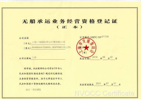 Shanghai Sunhill Shipping Co., LTD является компанией, обладающей квалификацией первого класса фрахтового агента в Китае, и имеет свидетельство НВОСС, утвержденное Министерством транспорта Народной Республики Китая. Главный офис расположен в Шанхае, а собственные офисы и филиалы есть в Нинбо, Циндао, Шэньчжэне. Мы также являемся членом WCA, поэтому заслужили доверие всех вас!
